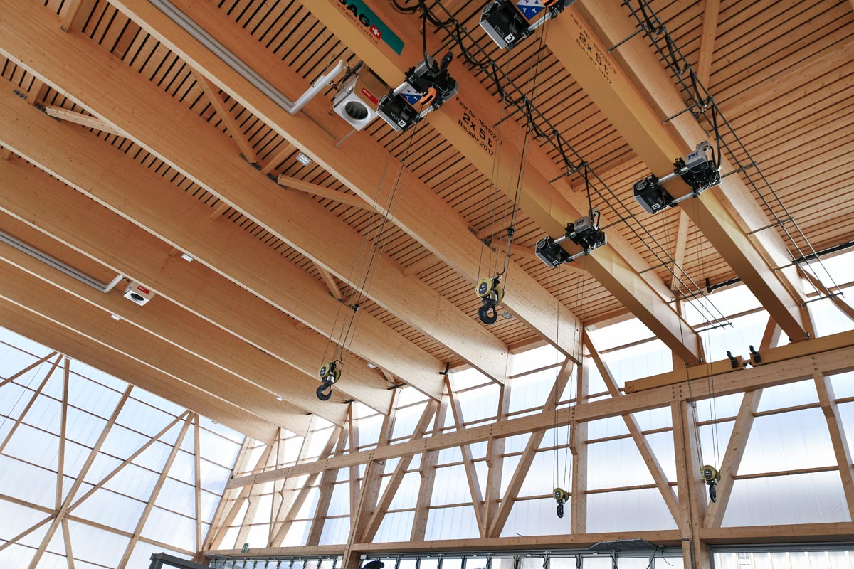 La structure porteuse principale des deux halles comprend 26 poutres surélevées en lamellé-collé d’une portée de 23 mètres. Celles-ci reposent sur sept pans de bois de portique qui s’étendent sur 14 mètres. Les charges de la grue, qui repose sur un chemin de roulement en lamellé-collé, sont également transférées des pans de bois aux supports de portique. Le contreventement est assuré par un assemblage faitier facile à assembler et enfichable.