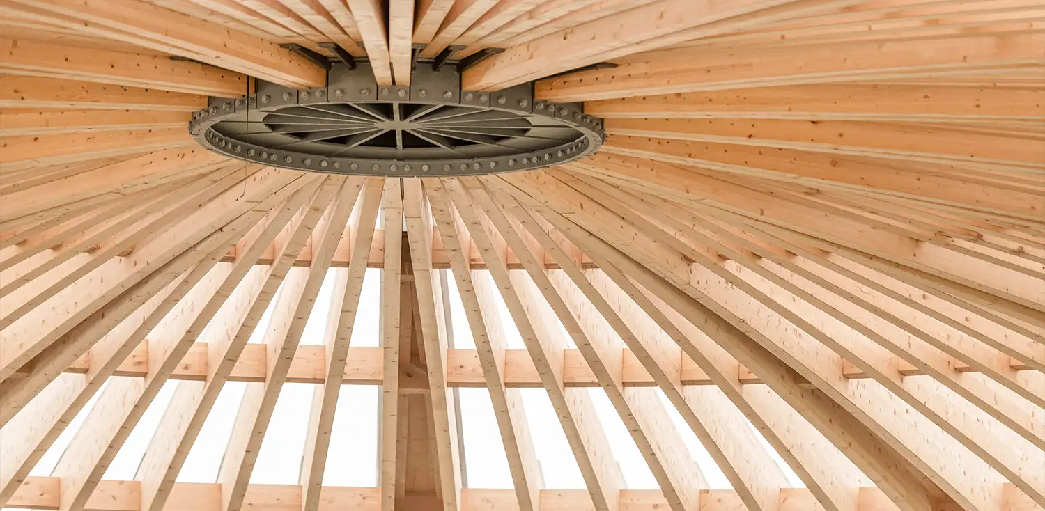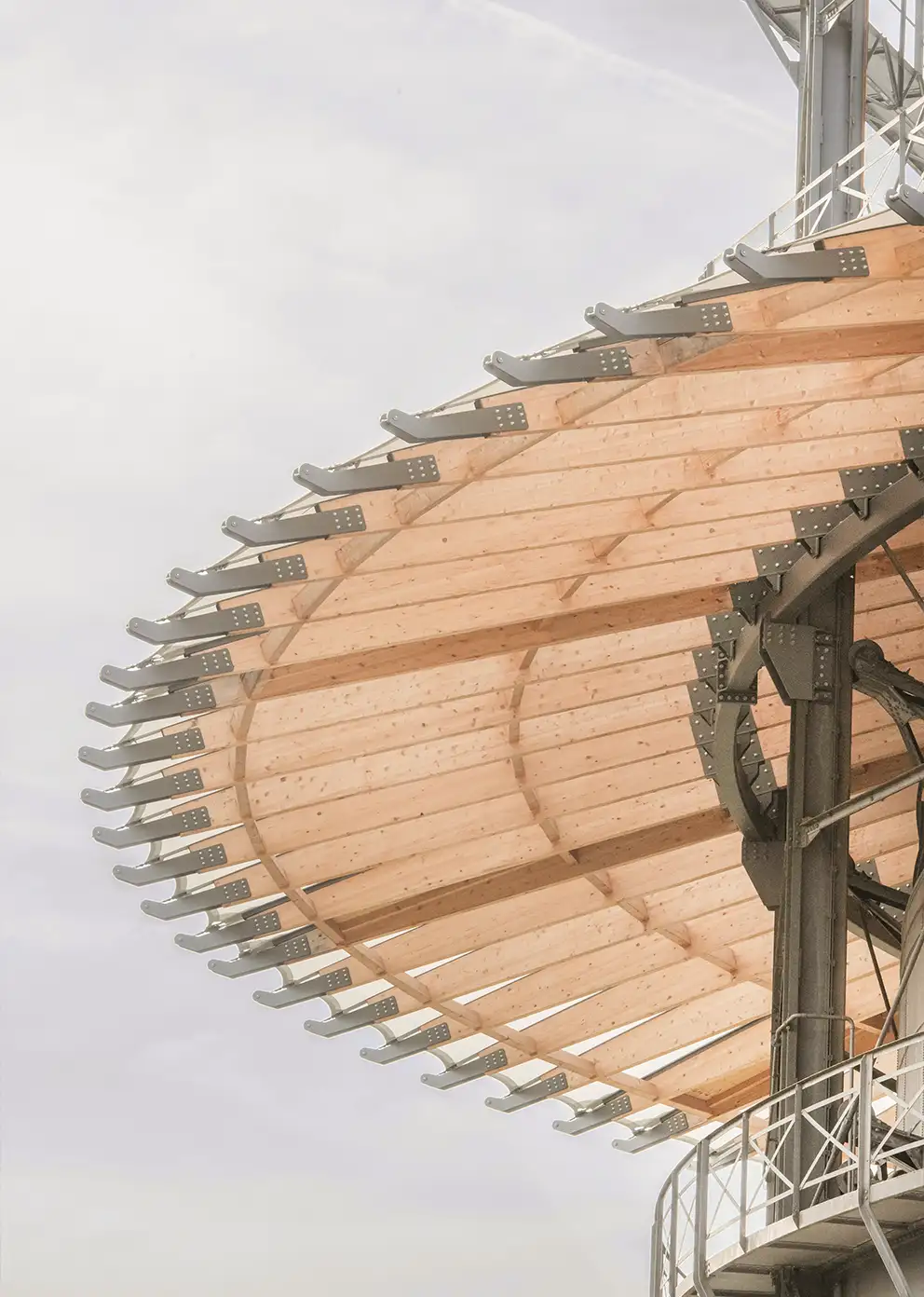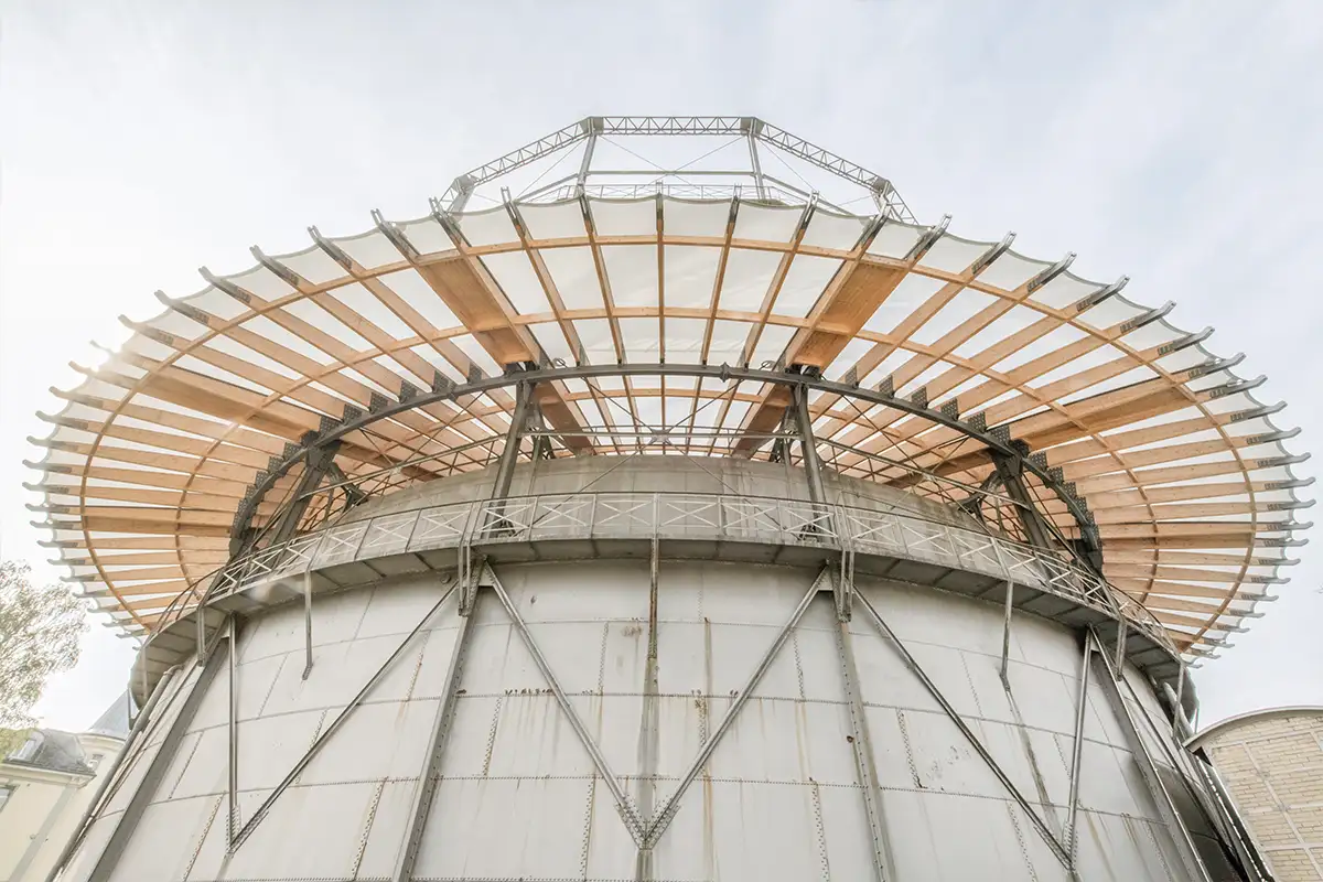 Le dernier réservoir de gaz télescopique de Suisse, menacé par la corrosion, a été préservé grâce à un parapluie unique en bois et membrane translucide. Installé au-dessus de la cloche avec un nœud central en acier et des éléments en porte-à-faux, il assure l’évacuation sécurisée de l’eau de pluie et protège le monument.