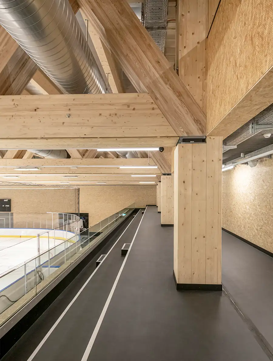 Die imposanten Fachwerke, mit einer Höhe von 3,7 Metern und einer Breite von 0,76 Metern, überspannen in einem Abstand von 8 Metern ein beeindruckendes 34-Meter-Eisfeld. Trotz ihres Gewichts von rund 29 Tonnen strahlen sie Leichtigkeit und Eleganz aus.