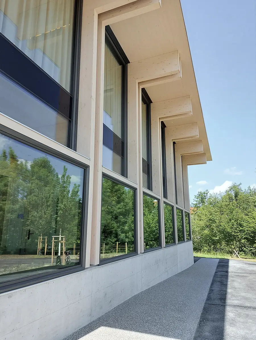 Dieses moderne und lichtdurchflutete Hallenbad erstrahlt in Appenzell. Der Neubau präsentiert sich stolz aus Appenzeller Fichten- und Tannenholz. Die auskragende Decke wird von Zwillingsträgern aus Brettschichtholz getragen, was dem Bauwerk eine besondere Ästhetik verleiht.