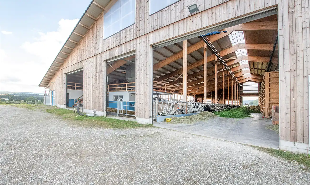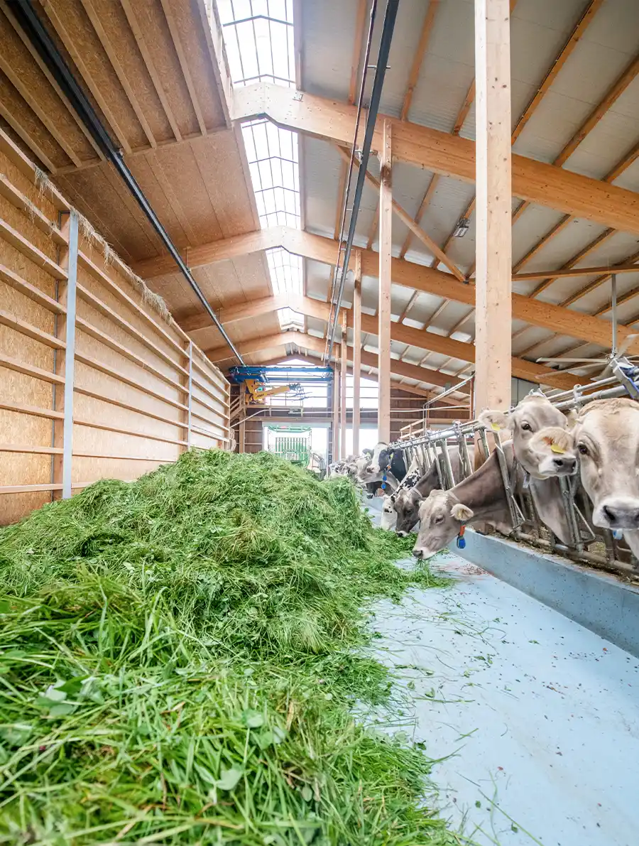 In Sins wurde ein moderner, grosser Boxenlaufstall errichtet, der den Kühen viel Platz für freie Bewegung sowie reichlich Licht und frische Luft bietet. Für das 32 × 50 Meter grosse Gebäude haben wir insgesamt acht Binderachsen gefertigt, abgebunden und die Stahlteile vormontiert – alles präzise aufeinander abgestimmt für eine effiziente Montage und maximale Stabilität.